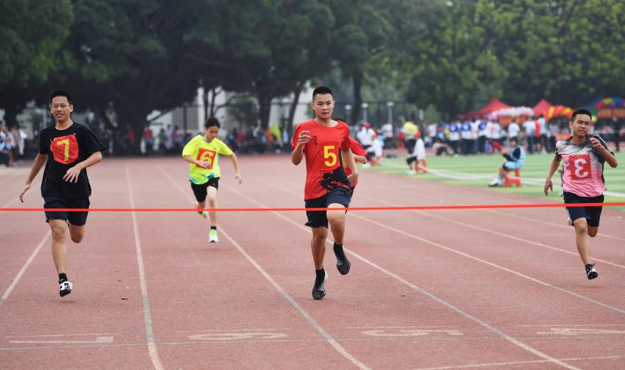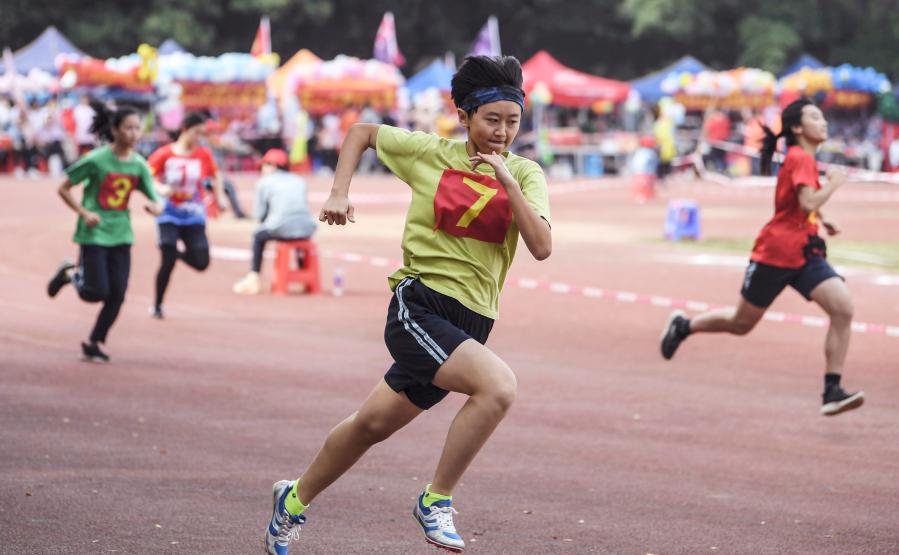 11月26日, 廣西大學(xué)附屬中學(xué)初中年級(jí)學(xué)生在200米跑比賽中。新華社記者張愛林?jǐn)z