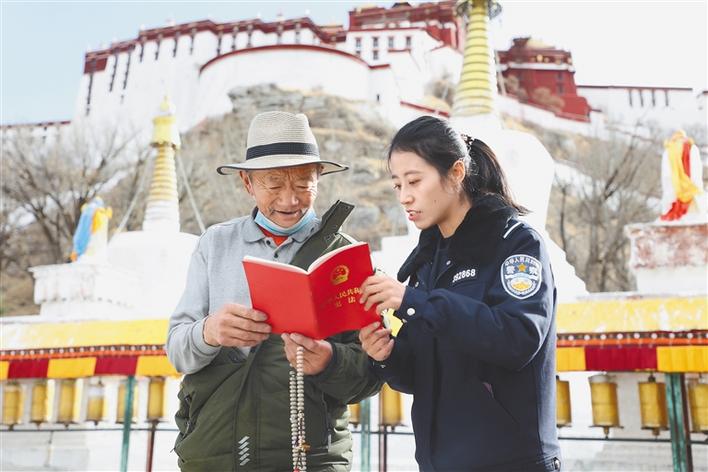 圖為西藏出入境邊防檢查總站執(zhí)法調(diào)查支隊民警在宗角祿康公園向過往群眾宣傳憲法知識。仁青旺堆 張一鳴 攝