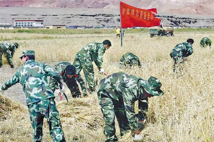 圖為駐地部隊(duì)組建“學(xué)雷鋒志愿服務(wù)隊(duì)”幫助烏江村村民秋收。