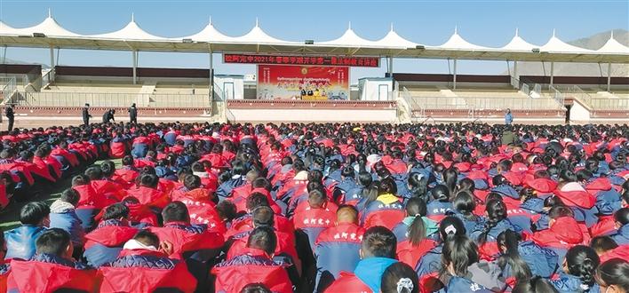 圖為拉薩阿里河北完全中學(xué)師生在校運(yùn)動(dòng)場(chǎng)舉行2021年春季開學(xué)典禮。圖片由拉薩阿里河北完全中學(xué)提供
