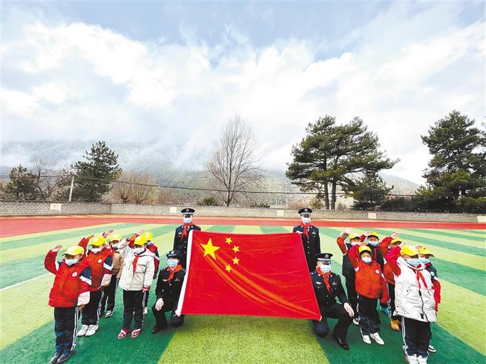 圖為林芝南伊邊境派出所民警與當(dāng)?shù)匦W(xué)生開(kāi)展“我與國(guó)旗合影”活動(dòng)。張猛 馬智慧 攝