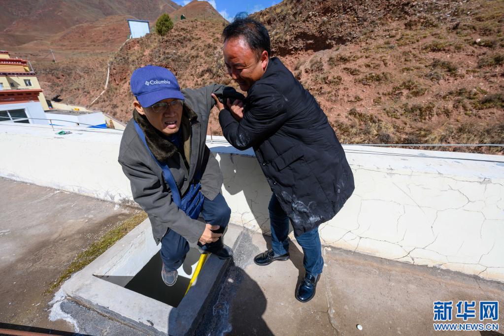 5月3日,在西藏昌都市類(lèi)烏齊縣吉多鄉(xiāng)小學(xué),李純民(左)在吉多鄉(xiāng)小學(xué)校長(zhǎng)鄧增群培的幫助下,爬上學(xué)生食堂樓頂,監(jiān)督太陽(yáng)能熱水器的維修工作。新華社記者 劉金海 攝