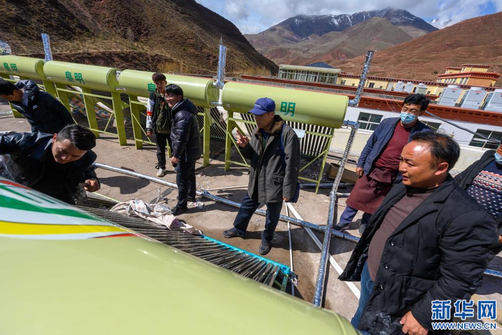 5月3日,在西藏昌都市類(lèi)烏齊縣吉多鄉(xiāng)小學(xué),李純民(中)在吉多鄉(xiāng)小學(xué)學(xué)生食堂樓頂,監(jiān)督太陽(yáng)能熱水器的維修工作。2014年至2020年,“齊興”助學(xué)獎(jiǎng)勵(lì)基金通過(guò)多種方式,籌集資金200多萬(wàn),為類(lèi)烏齊縣12所鄉(xiāng)鎮(zhèn)小學(xué)安裝太陽(yáng)能熱水器和多媒體教學(xué)一體機(jī)。新華社記者 劉金海 攝