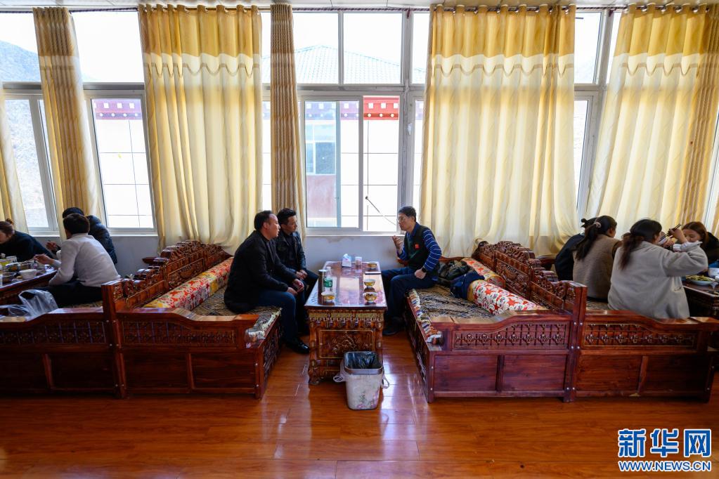 5月2日,在西藏昌都市類(lèi)烏齊縣濱達(dá)鄉(xiāng)濱達(dá)村,李純民(左二)在當(dāng)?shù)卮迕裣虬桶偷牵ㄓ叶┘抑胁榭凑託夤薜氖褂们闆r。新華社記者 劉金海 攝