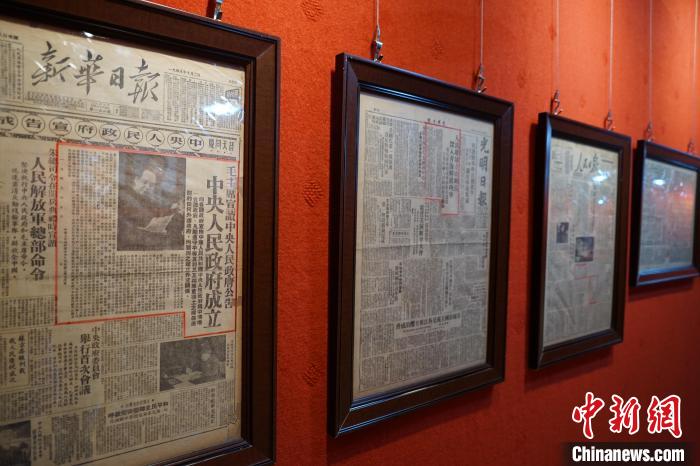 “這份最為寶貴,”索昂生格指著廊邊的第一幅相框,是《新華日?qǐng)?bào)》1949年10月2日的報(bào)紙,頭版“中央人民政府宣告成立”大字醒目,“它見(jiàn)證了歷史。”