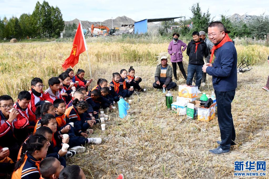 援藏教師潘杰帶著學(xué)生在青稞地里上思政課(2021年9月14日攝)。