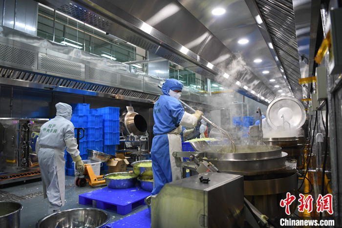 圖為3月11日,西藏自治區(qū)拉薩市城關(guān)區(qū)凈土拉薩中央廚房配餐車間內(nèi),工作人員正在為學(xué)生集中配餐。 中新社記者 貢嘎來松 攝