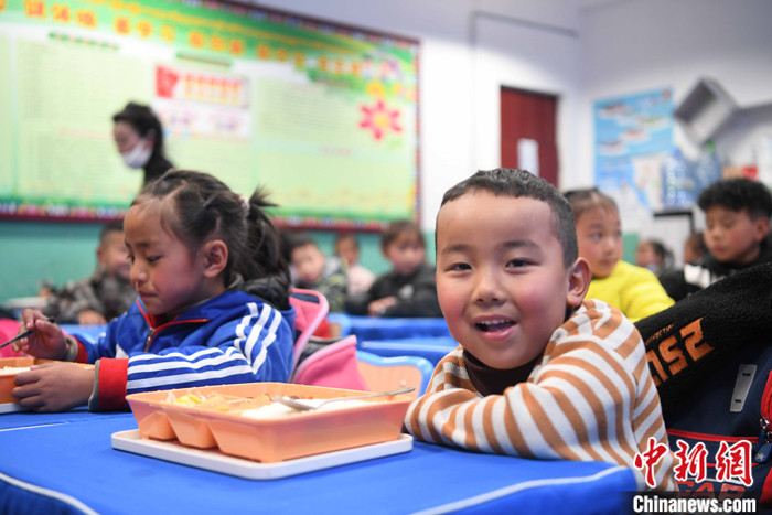圖為3月11日,西藏自治區(qū)拉薩市城關(guān)區(qū)第三小學(xué)的學(xué)生食用營(yíng)養(yǎng)午餐。 中新社記者 貢嘎來松 攝