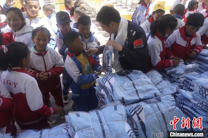 圖為拉薩出入境邊防檢查站的民警為學生發(fā)放校服?!∝暩聛硭?攝