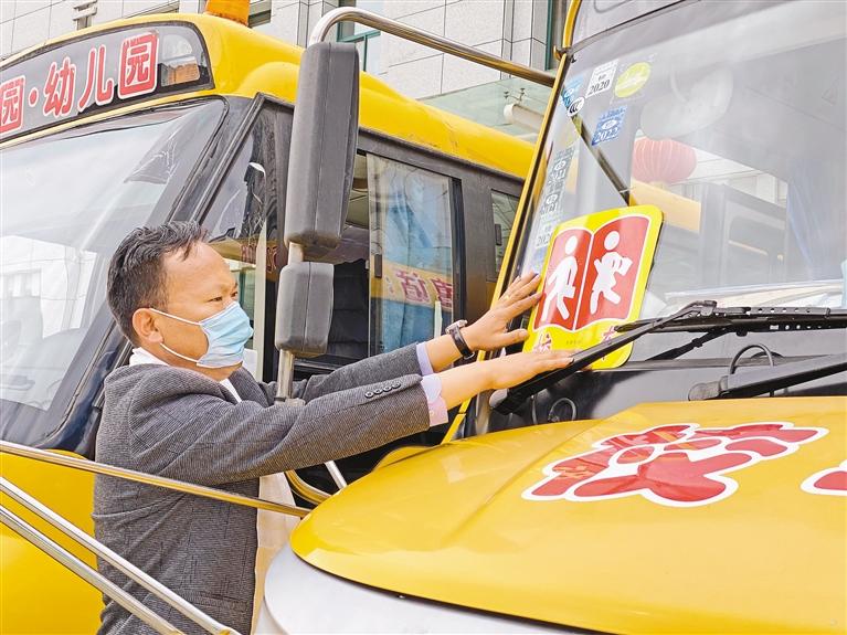 圖為游樂園幼兒園校車司機(jī)給校車擺放車輛許可證。記者 鹿麗娟 攝