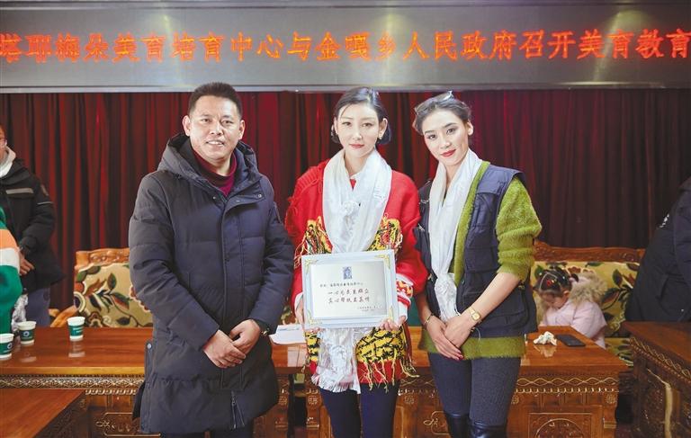 洛桑卓瑪(中)帶領(lǐng)團隊前往日喀則市江孜縣金嘎鄉(xiāng)開展美育公益活動。