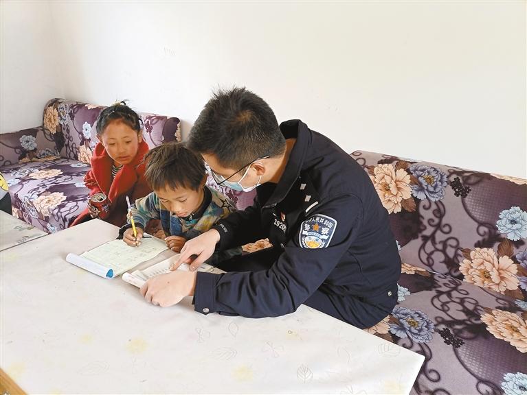 “老師,小扎西最近在學(xué)校表現(xiàn)的怎么樣?”扎西江措在上察隅鎮(zhèn)小學(xué)上一年級,這個年齡段的孩子,最是調(diào)皮的時候,每當(dāng)派出所民警下鄉(xiāng)走訪經(jīng)過學(xué)校時,都會找到小扎西的班主任詢問最近狀況。孩子們?nèi)粘W(xué)習(xí)、生活中的一舉一動,不僅牽動著派出所民警的心,也牽動著遠(yuǎn)在千里之外駐村民警化旦的心?!翱络?,孩子們最近還好嗎?我看物流信息顯示圖書和零食已經(jīng)到了,你們下鄉(xiāng)的時候就把東西帶過去……”2020年,化旦分配到上察隅邊境派出所,喜歡孩子的他,迅速和扎西、拉姆打成一片,平時只要有空便帶著學(xué)習(xí)、生活用品去看他們,為了迎合孩子們的興趣愛好,化旦也會從網(wǎng)上學(xué)習(xí)兒童歌曲、舞蹈,與孩子們一起唱歌跳舞。