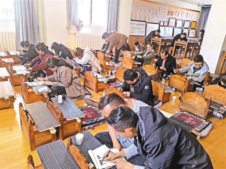 娘熱小學(xué)的書法室內(nèi),與藏戲課堂的熱鬧氛圍截然不同,剛剛?cè)腴T藏文書寫的一、二年級(jí)小朋友正握著筆,在“墻星”書寫板上安靜、認(rèn)真地書寫著藏文。來自拉薩市文聯(lián)書法家協(xié)會(huì)的藏文書法家指導(dǎo)著孩子們的握筆姿勢(shì)、書寫習(xí)慣,學(xué)校的藏文組老師也在一旁認(rèn)真學(xué)習(xí)聽講。