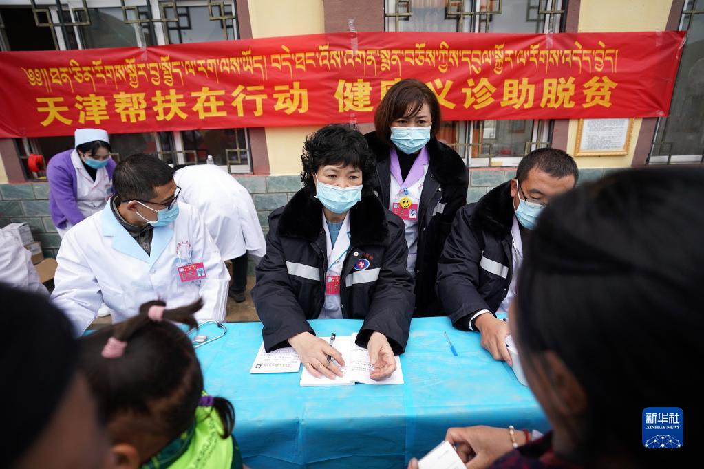 在西藏昌都市江達縣卡貢村,天津援藏醫(yī)生王佩華(中)為村民義診(2020年9月26日攝)。新華社記者 詹彥 攝