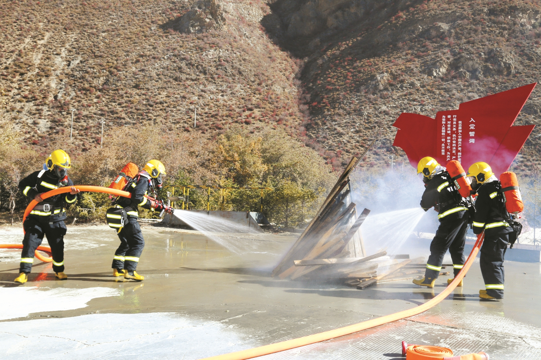 圖為啟動儀式現(xiàn)場,消防員進行滅火救援演練。拉薩融媒通訊員德吉卓嘎攝