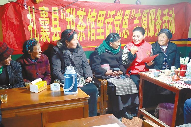 圖為扎囊縣新時(shí)代文明實(shí)踐志愿者在甜茶館與群眾話黨恩。記者 段敏 攝
