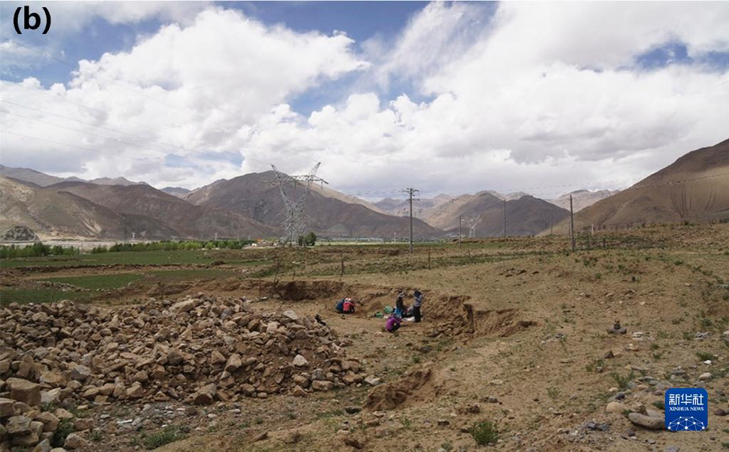 圖(b)為科考隊員發(fā)現(xiàn)共塘遺址后隨即進行地層剖面清理和樣品采集。(資料圖片由第二次青藏科考隊“人類活動歷史及其影響”分隊提供)