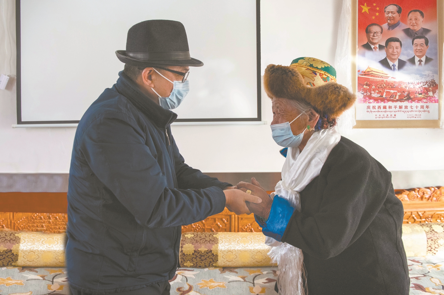 圖為市委副書記、市長王強(qiáng)為城關(guān)區(qū)特困人員集中供養(yǎng)中心的老人敬獻(xiàn)哈達(dá),致以節(jié)日美好祝福。拉薩融媒記者 玉珠多杰攝