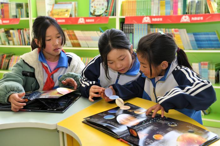 藥山鎮(zhèn)中心小學(xué)的同學(xué)們?cè)谛麻喿x室閱讀新書。