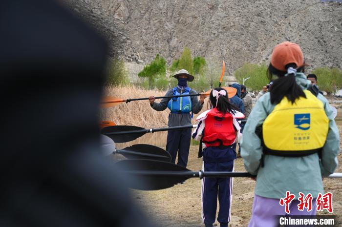 圖為皮劃艇教練向體驗者講授皮劃艇操作技術。 趙朗 攝
