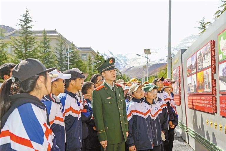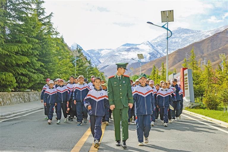 武警官兵帶領(lǐng)學生參觀營區(qū)。索朗旺堆 記者 旦增蘭澤 攝