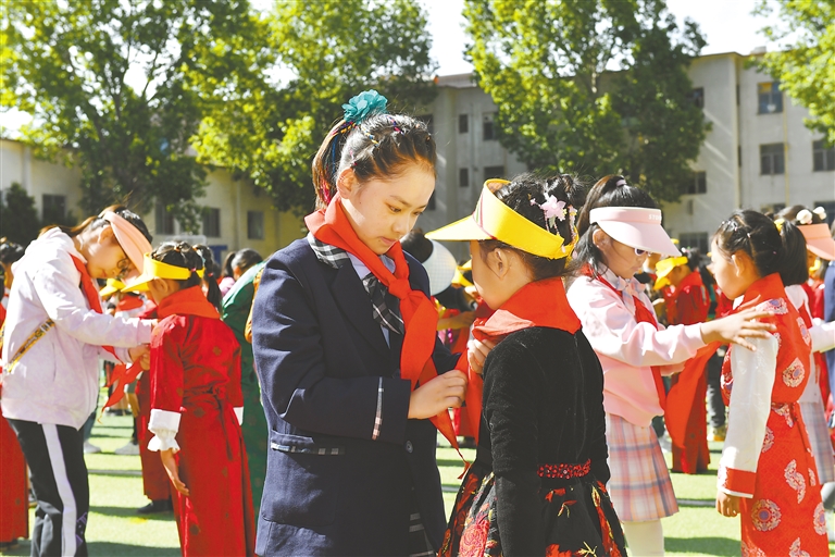 拉薩市第三小學少先隊老隊員為新入隊隊員系紅領(lǐng)巾。記者 次仁平措 攝