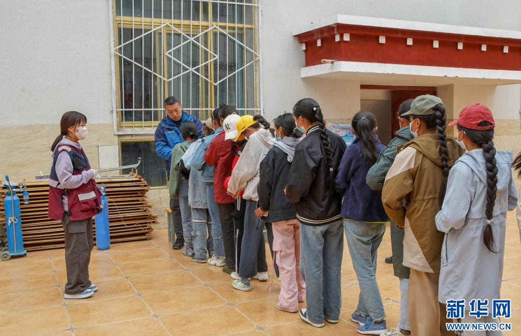 4日上午,在那曲市色尼區(qū)尼瑪鄉(xiāng)小學(xué)學(xué)生宿舍一樓大廳,學(xué)生們齊刷刷排成隊等待做心臟聽診?!奥犜\有問題的同學(xué),由老師帶去做心臟彩超?!鳖I(lǐng)隊醫(yī)生耿直一邊吸氧一邊聽診。