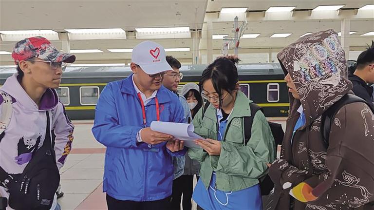 “到西部去、到基層去、到祖國和人民最需要的地方去?!?月24日,2023屆大學生西部計劃西藏專項志愿者陸續(xù)抵藏報到。現(xiàn)場,共青團西藏自治區(qū)委員會組織了前幾屆志愿者在火車站接站?!拔沂菑暮幽线^來做志愿者的,在西藏已經(jīng)2年了,一直在自治區(qū)經(jīng)信廳上班。今天是過來接學弟學妹們的,幫助他們登記報到?!表n義凡說。中午11點左右,火車進站,志愿者們陸續(xù)前來報到?!斑@是我第一次來西藏,還是以志愿者的身份,我會好好工作,為西藏的發(fā)展作出自己的貢獻?!眮碜蕴旖虻奶锟苏f。