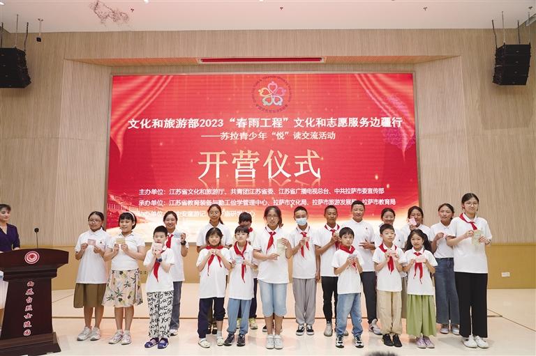 儀式上,江蘇和拉薩兩地青少年圍繞“中華民族一家親,同心共筑中國夢”主題開展了互助結(jié)對儀式和“春雨工程”授旗儀式,范躍平和陳兵共同將文旅部“春雨工程”項目旗幟授給本次活動項目領(lǐng)隊、拉薩市圖書館館長朱純琳。