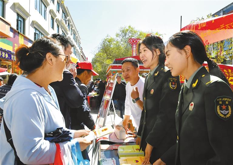 圖為9月16日上午,相關(guān)單位工作人員在拉薩宇拓路街頭為過往群眾講解國防安全知識。記者 旦增蘭澤 攝