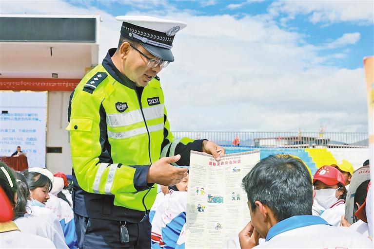 圖為交警向?qū)W生講解道路交通安全知識(shí)。記者 旦增嘎瓦 攝