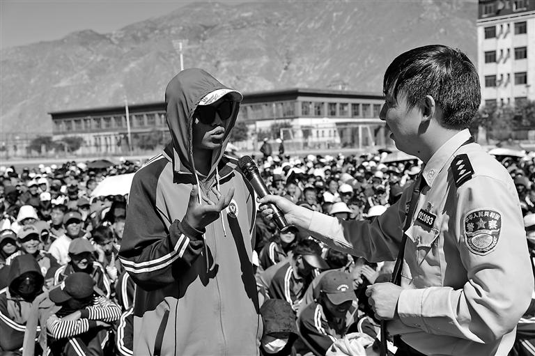 宣傳活動(dòng)中,拉薩市第一中等職業(yè)技術(shù)學(xué)校學(xué)生和區(qū)公安廳網(wǎng)安總隊(duì)民警熱情互動(dòng)。記者 彭琦 攝