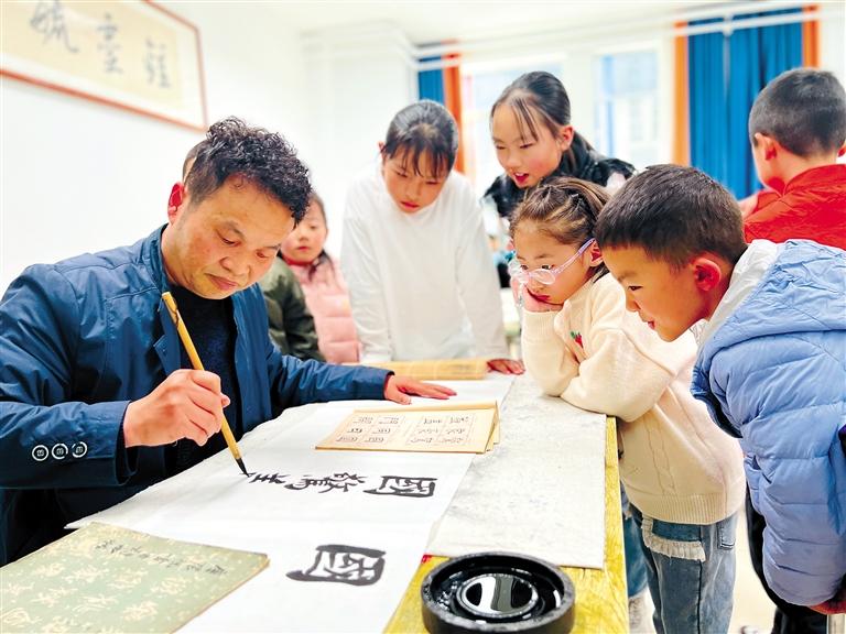 圖為流動少年宮進鄉(xiāng)村活動中,少兒們展示自創(chuàng)的繪畫。
