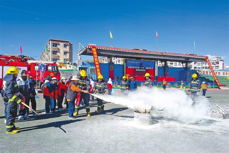 11月5日,2023年日喀則市“119”消防宣傳月活動啟動儀式在日喀則市第三高級中學舉行。日喀則市消防安全委員會成員單位及師生代表共1500余人參加活動?;顒又?,消防技能挑戰(zhàn)、消防科普互動、消防裝備展覽、改革轉(zhuǎn)隸五周年成果展、消防技能展示等,吸引了大批師生近距離體驗消防、認識消防,進一步筑牢校園消防安全“防火墻”。