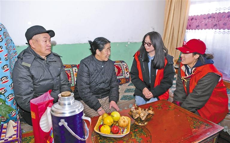 圖為拉薩市城關(guān)區(qū)策門林社區(qū)工作人員正在與轄區(qū)民族團(tuán)結(jié)家庭嘮家常。 記者 唐斌 攝