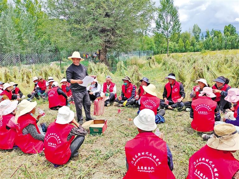 圖為乃東區(qū)新時代文明實踐志愿服務(wù)隊在田間地頭學(xué)習(xí)強農(nóng)惠農(nóng)政策。記者 劉楓 攝