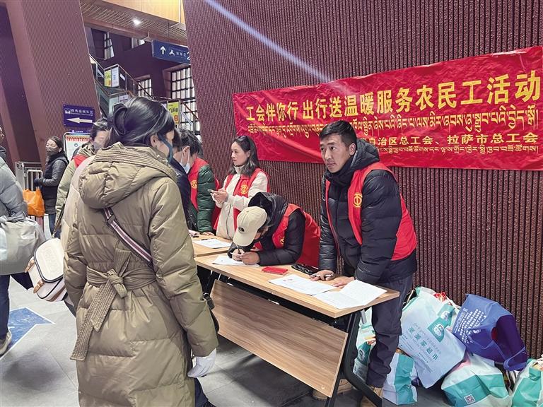 1月31日,西藏自治區(qū)總工會與拉薩市總工會聯(lián)合柳梧新區(qū)公安局應(yīng)急處突大隊、中國青藏鐵路集團有限公司,在拉薩火車站內(nèi)為返鄉(xiāng)農(nóng)民工發(fā)放1000份“工會愛心大禮包”,并提供乘車咨詢、便民服務(wù)、維持秩序等服務(wù),將工會組織的溫暖送到農(nóng)民工心坎上。
