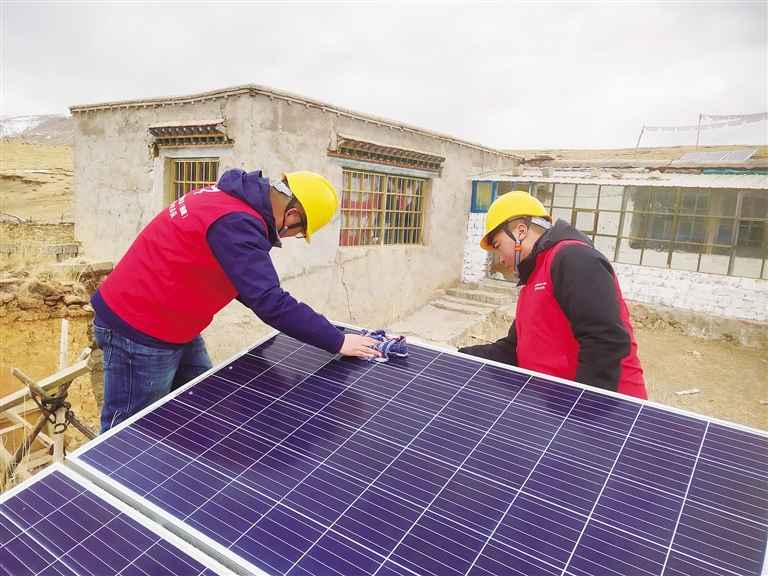 “次桑在家嗎?我們過(guò)來(lái)看一下你們新年準(zhǔn)備得怎么樣了?”聽(tīng)到劉光輝的呼喚,孩子們都跑出來(lái)迎接這位“小黃帽”叔叔。劉光輝和羅桑歐珠進(jìn)屋放下年貨,顧不上休息,立馬搭梯子爬上次桑家的房頂,用抹布拂去光伏電板上的塵土,拿出工具仔細(xì)檢查電源和光伏設(shè)備是否有損壞?!按紊<矣玫氖俏覀兊牡谝淮?yáng)能光伏電板,這個(gè)電板要經(jīng)常擦拭,保持表面干凈,發(fā)電效率會(huì)更好?!眲⒐廨x說(shuō)。檢修完光伏電板后,劉光輝和羅桑歐珠又回到屋內(nèi)檢查次桑家的電路線路,對(duì)插排插座等可能存在安全隱患的地方進(jìn)行認(rèn)真排查。確保沒(méi)有問(wèn)題后,兩人將之前昏暗的燈泡全部換成了最新的節(jié)能燈泡,整個(gè)屋子一下亮堂了起來(lái)。