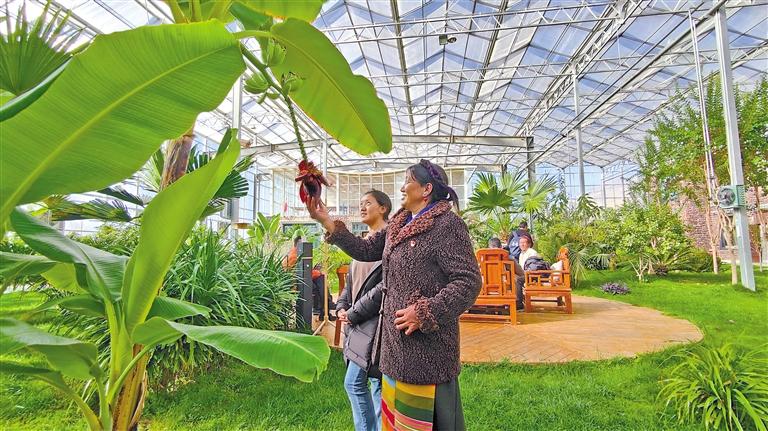 隆冬時節(jié),山南市扎囊縣阿扎鄉(xiāng)的南方植物展示館內,一派郁郁蔥蔥的景象。椰子樹、鶴望蘭、凌霄花相映成趣。該館是藏草萬畝植物種苗繁育基地的一部分,可為參觀游客提供林草科普知識講解,為學生開設生態(tài)課堂進行研學實踐等。