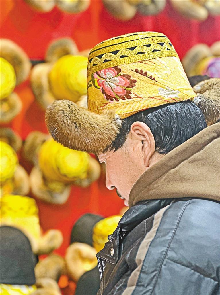 拉薩市民在試戴藏式禮帽。記者 格桑倫珠 攝