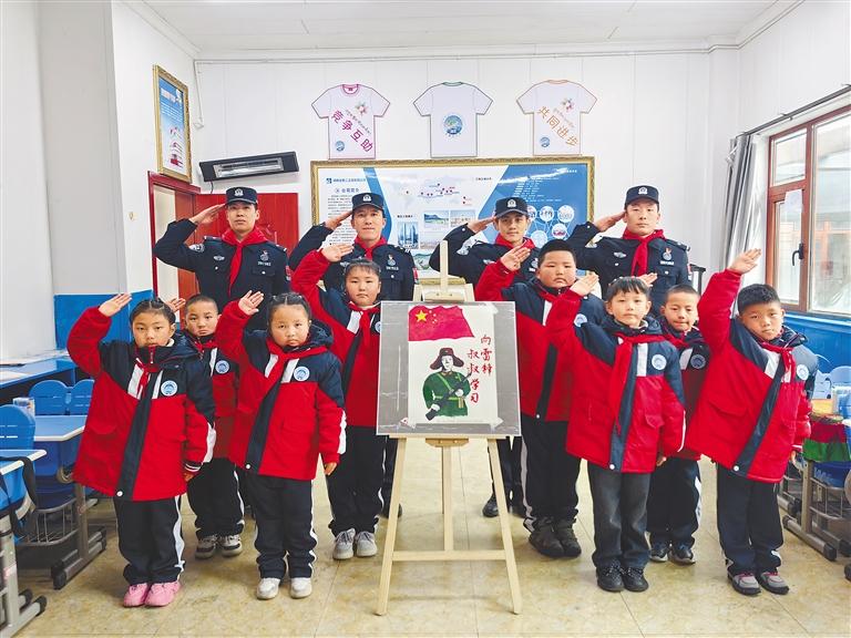 圖為玉麥邊境派出所民警、玉麥鄉(xiāng)小學(xué)學(xué)生與雷鋒畫像合影。通訊員 扎西根培 記者 張宇 攝