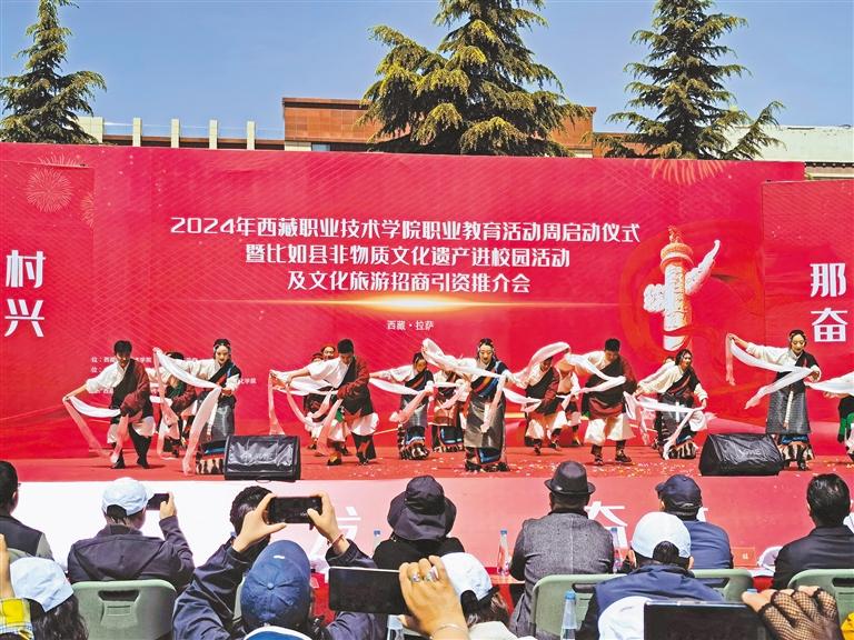 日前,2024年西藏職業(yè)技術(shù)學(xué)院職業(yè)教育活動(dòng)周在拉薩啟動(dòng)。那曲市比如縣非物質(zhì)文化遺產(chǎn)走進(jìn)校園,激發(fā)了學(xué)生和老師對(duì)傳統(tǒng)文化濃厚的興趣。