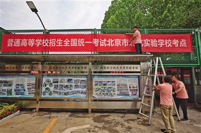 6月6日,記者在北京航空航天大學實驗學校中學部(簡稱“北航實驗學校”)考點看到,學校西門處已懸掛起高考考點橫幅、考場布置已就位,校園內(nèi)放置了多個溫馨的提示語標牌。據(jù)悉,該校是今年新增高考考點之一,承接來自9所學校277名考生的高考組考任務。此外,記者還探訪了北京高考人大附中經(jīng)開學??键c