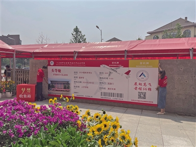 “2024高考加油”“高考就是高高興興地考試”“保持靜心,增強信心,做題專心,考試細心”……考生一進考點,就可以看到這些鼓舞人心的標語。走出考點時,一張巨型“圓夢號”頭等艙登機牌映入學生眼簾,祝福考生們展翅高飛,前程似錦。