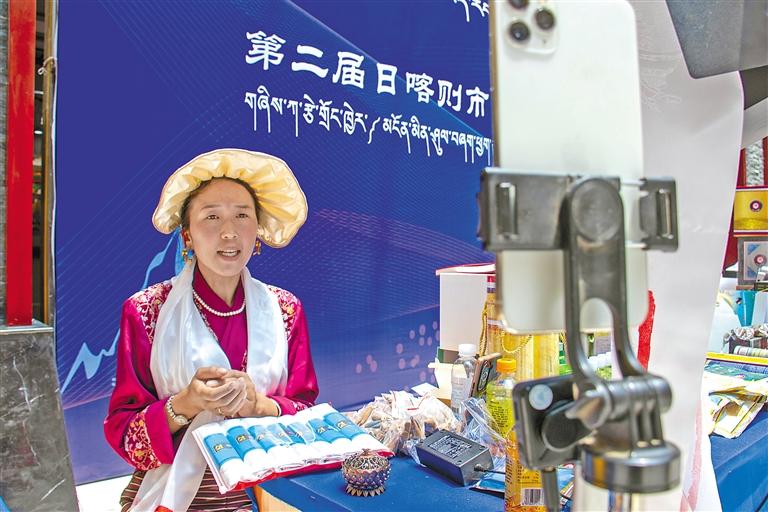 在日喀則市非遺展銷現(xiàn)場(chǎng),主播通過直播為網(wǎng)友介紹非遺特產(chǎn)。記者 旦增嘎瓦 楊子彥 扎西頓珠 攝