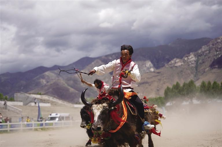 此時,賽場另一邊傳來歡呼,循聲望去,原來是本屆運動會的賽牦牛正在進行。雖然牦牛生性溫和,但讓它們聽命令奔跑,也并不容易。記者了解到,參加本屆運動會的牦牛均由主人精挑細選,主人一聲吹哨,輕微地蹬腳,牦牛就會按指令向前行進,顯得默契十足。但偶爾也會發(fā)生小狀況,比如牦牛分不清方向擠成一團,跑著跑著就停頓休息,或者原路返回等,引得觀眾頻頻發(fā)笑。