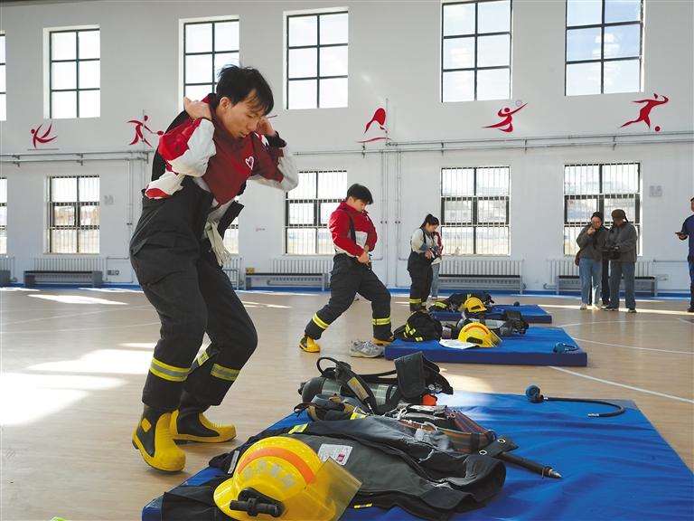 青年志愿者體驗原地穿著滅火救援服。 通訊員 土旦穆朗 攝