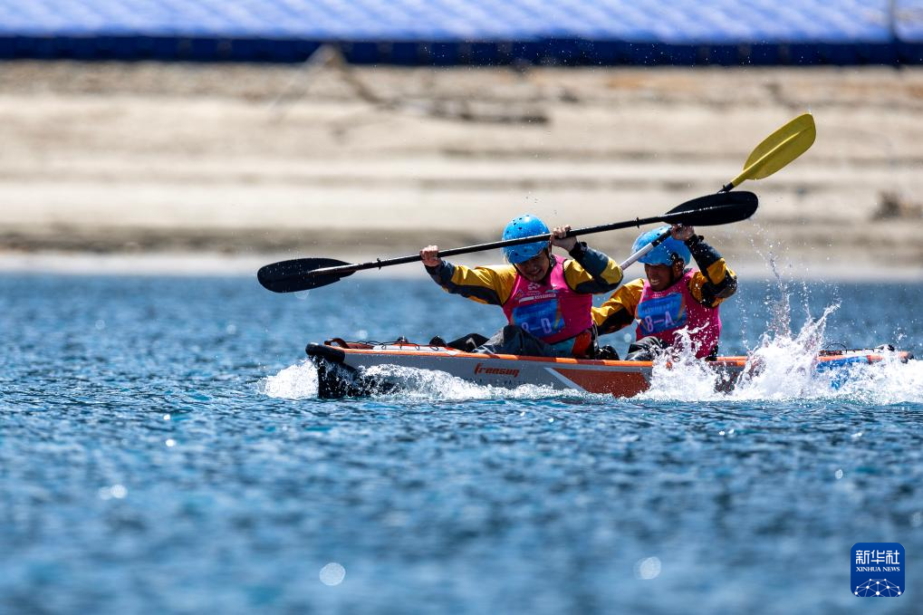 4月20日, “成都伽斯特健身俱樂部”選手許永召(右)、劉建宇在兩人漂流艇競速賽比賽中。他們最終獲得冠軍。新華社記者 姜帆 攝