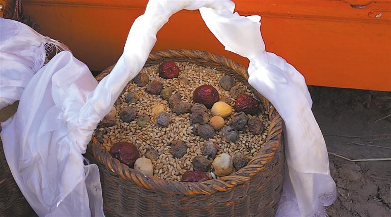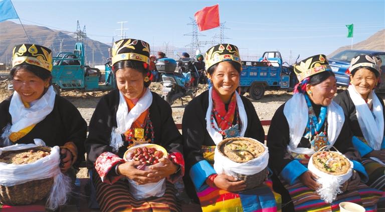 墨竹工卡縣扎雪鄉(xiāng)格老窩村婦女帶著用精致的柳編制品盛放的吉祥物,參加春耕春播儀式。