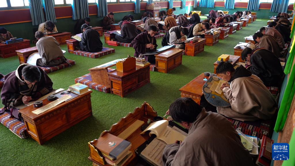 11月22日,昌都市丁青縣擁忠文化藝術中心非遺扶貧就業(yè)工坊學員在練習藏文書法。新華社記者 普布次仁 攝
